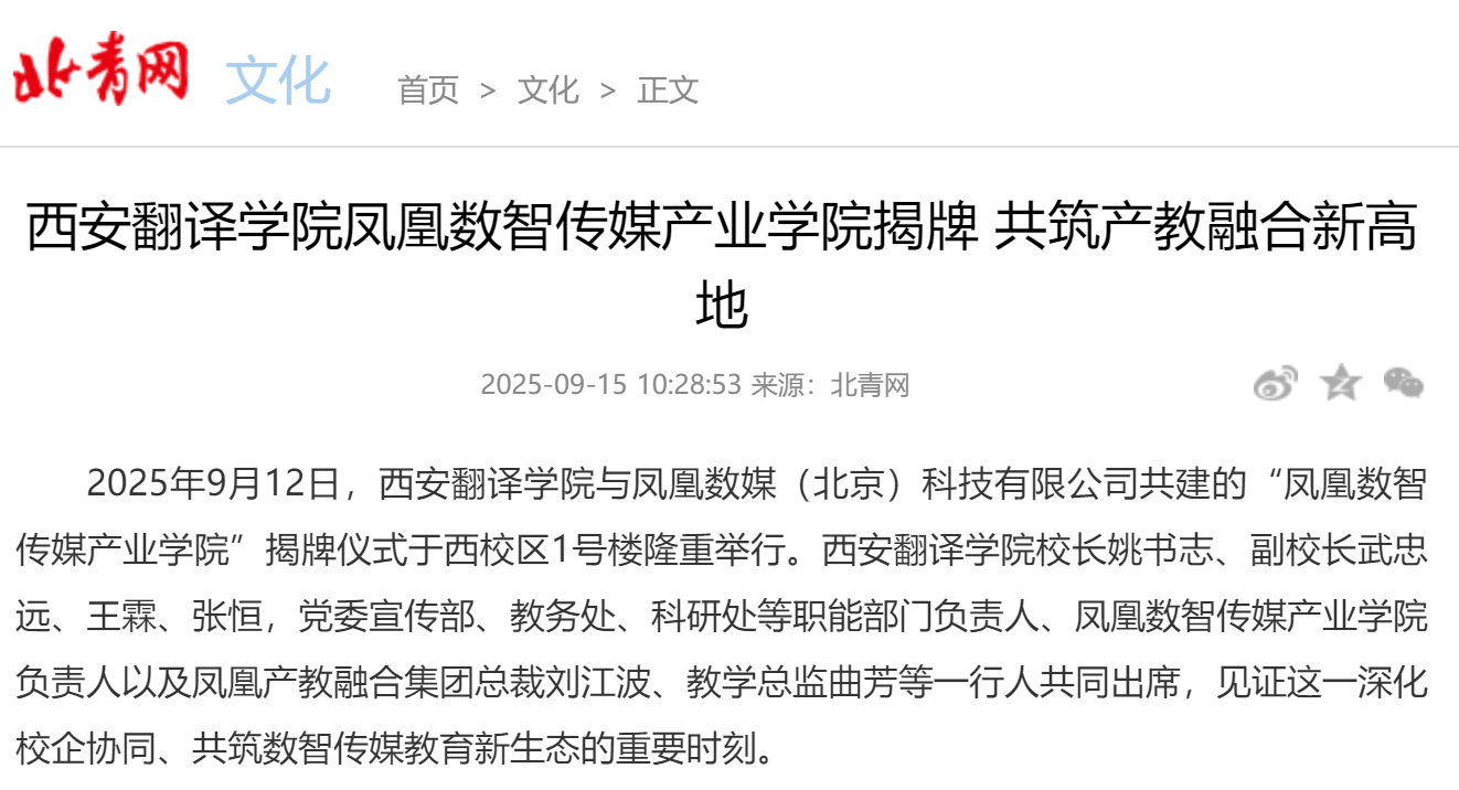 2025年9月12日,西安翻译学院与凤凰数媒(北京)科技有限公司共建的“凤凰数智传媒产业学院”,在西安翻译学院西校区1号楼举行揭牌仪式。据悉,凤凰数智传媒产业学院揭牌获人网、凤凰网、教育新闻等多家媒体平台持续关注报道,校企协同育人的创新实践引发行业关注。