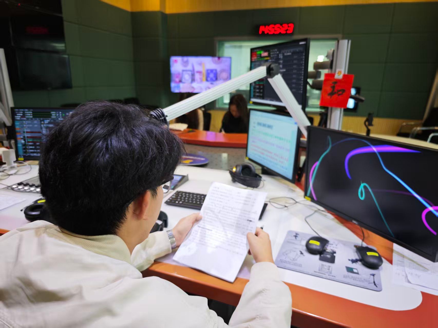 来到西安广电中心,学生们首先在工作人员的引导下参观了直播间、导播间等工作区域,了解广播节目的制作流程和播出方式,并与相关人员进行了深入交流。随后开始本期《大学生来了》节目的创作和播出,体验了从节目策划、文稿撰写到现场播报、嘉宾访谈等完整的节目制作流程。节目主持人杨朔对学生们进行了悉心指导,从发音吐字、语气语调到节目节奏把控、互动技巧等方面进行了细致讲解和示范。学生们认真学习、积极实践,展现出良好的专业素养和学习能力。“同学们专业基础扎实,学习热情高涨,他们的到来也为我们的节目注入了新鲜活力。”杨朔对西译播主学子给予了高度评价。