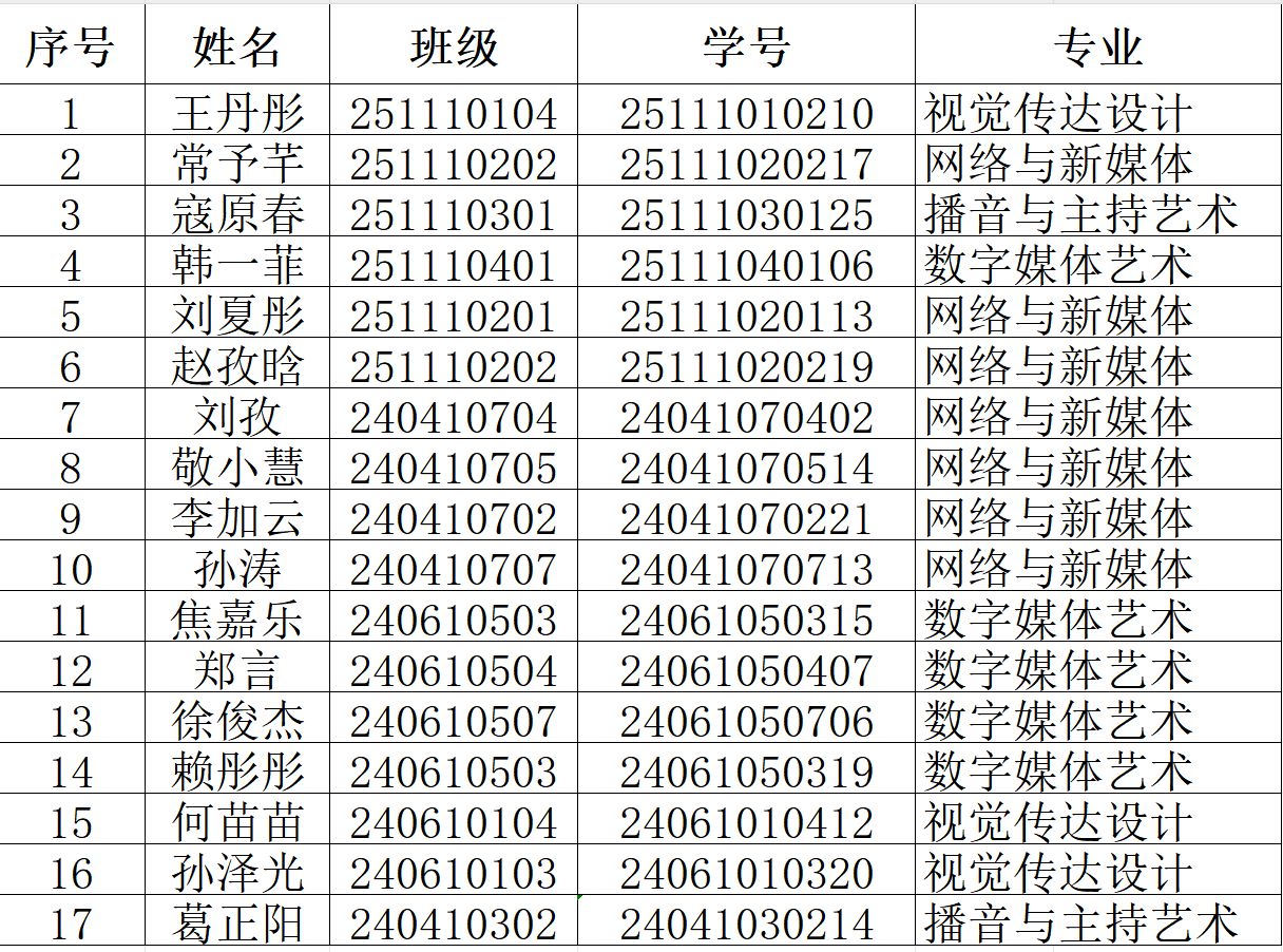 以上17名同学在10月份的晨读晨练过程中表现突出,积极带动班级同学晨读晨练,充分展现了我院学子的自律风采与集体意识。此次表彰旨在树立先进典型,鼓励全院学生以榜样为标杆,养成自律自觉的学习生活习惯,锤炼坚毅品格,提升综合素养,共同营造勤学善思、求真务实的学风校风。学院将结合传媒专业特色,持续开展形式多样的学风建设活动,创新活动载体、丰富内容内涵,为学生搭建更多实践展示与能力提升的平台,吸引更多学子主动参与其中。同时,学院将定期开展“晨读晨练之星”评选表彰工作,持续激发学生学习热情,助力学子成长成才。