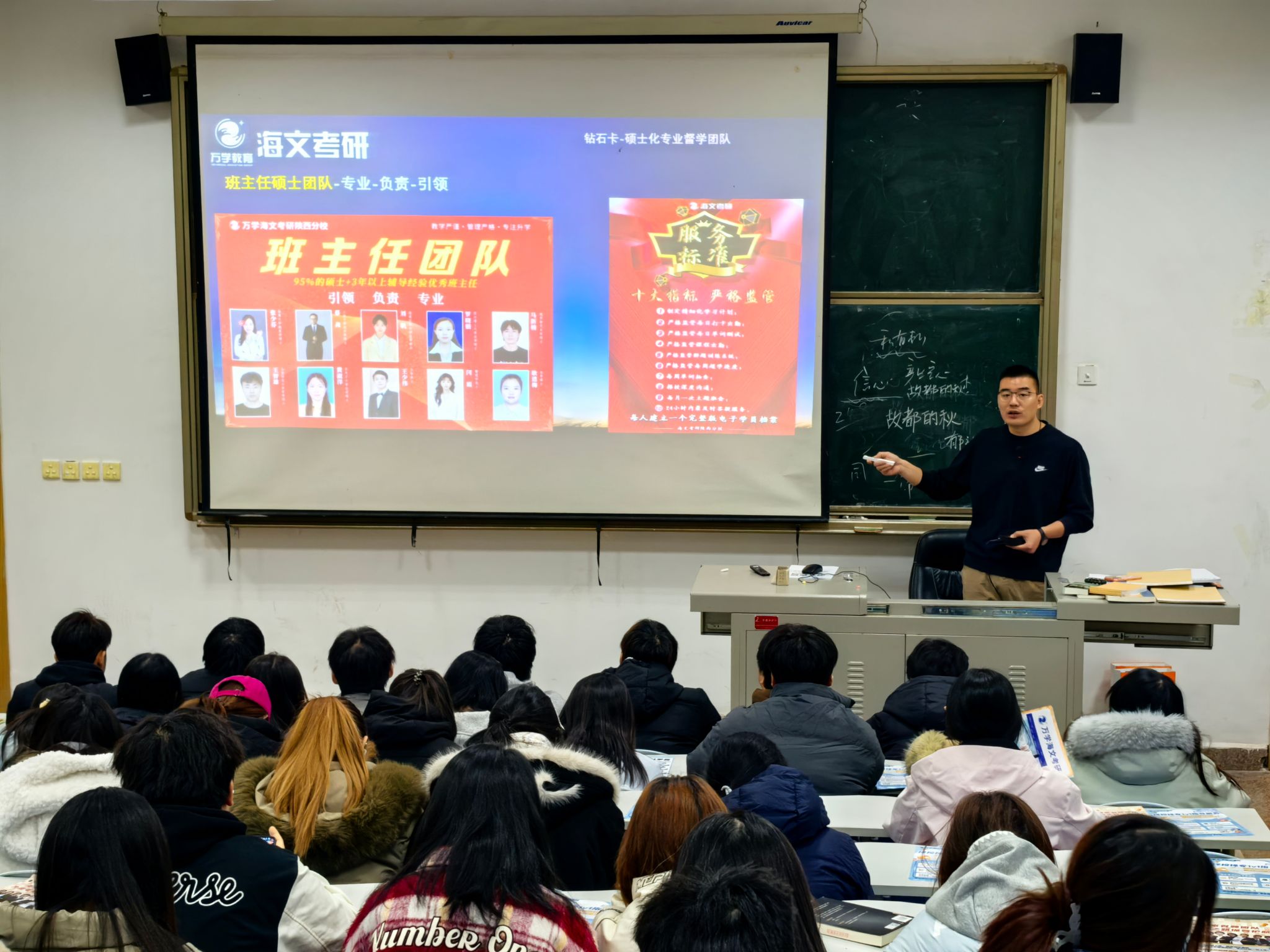 讲座开篇,张萌飞介绍到万学教育海文考研,自创立以来,已成功助力百万学子逐梦考研。海文考研构建了包含师资力量、课程体系、教学服务等在内的十大指标体系。凭借科学的教学方法、严格的教学管理和对升学结果的高度重视,帮助众多学员成功上岸。他特别提及,多届西安翻译学院学子通过海文考研的系统辅导成功上岸,为在场学生树立了鲜活榜样。