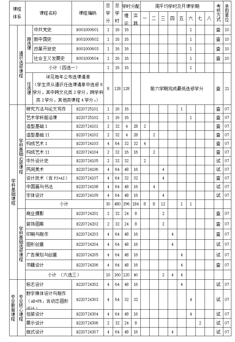核心课程:图形创意、字体设计、编排设计、包装设计、VIS设计、书籍设计、商业摄影、传播与策划(含招贴设计)、标志设计、展示设计